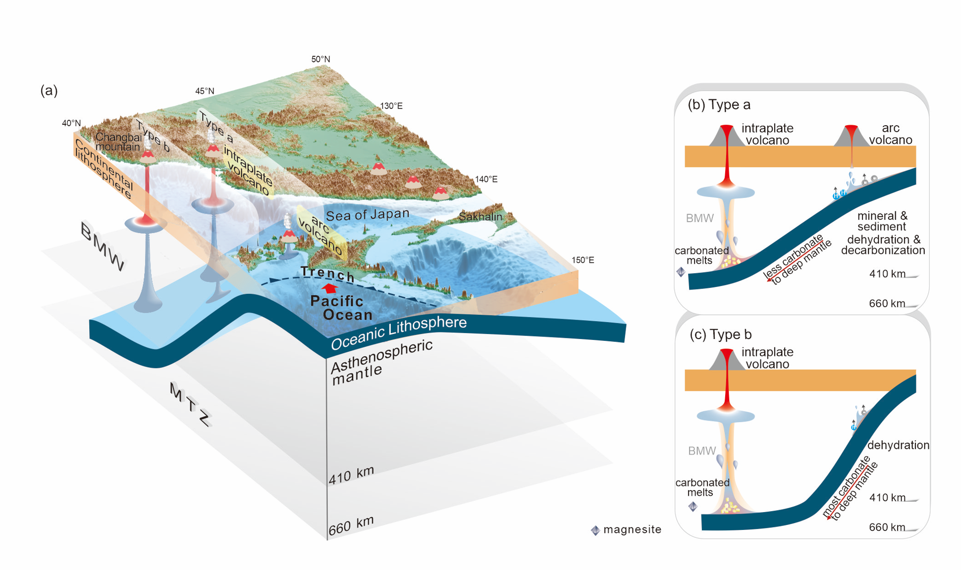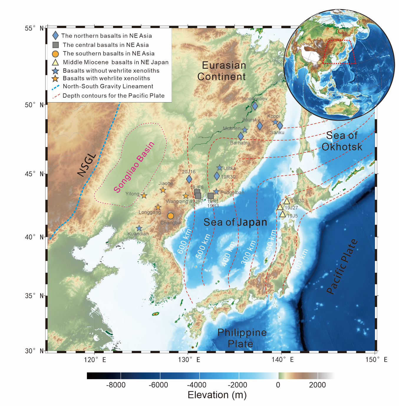 针对这一关键问题,我院许文良教授引领的“吉林大学地球深部动力学创新团队”联合中国地质大学(北京)刘盛遨教授,对东北亚陆缘、平行于俯冲带分布的中新世板内玄武岩开展了系统的Mg-Zn同位素研究(图1),结合东北亚陆缘新生代玄武岩中地幔捕虏体的空间分布和地球物理观测资料,为单一俯冲带小尺度碳输入的三维空间变异提供了关键证据。具体研究成果如下: