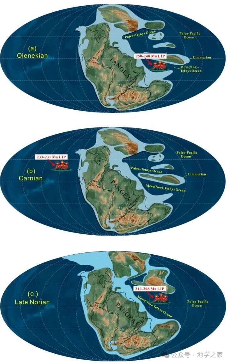 图2三叠纪250–248 Ma,233–231 Ma和210–208 Ma海相大火成岩省喷发事件