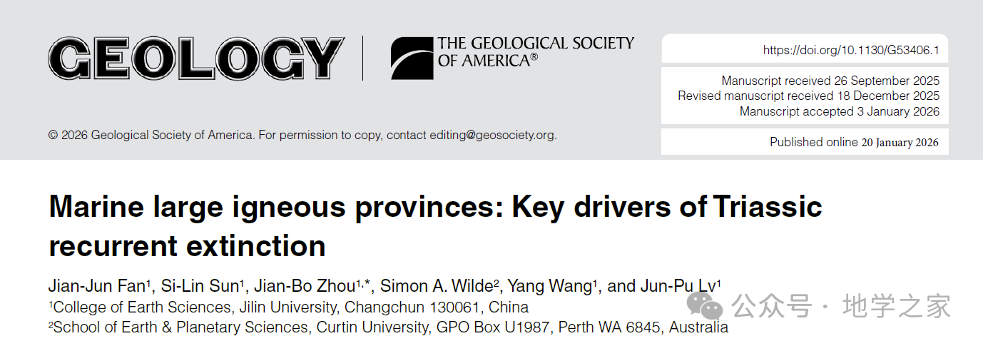 论文链接:Jian-Jun Fan(范建军), Si-Lin Sun(孙思霖), Jian-Bo Zhou†(周建波), Simon A. Wilde, Yang Wang(王洋), and Jun-Pu Lv(吕峻浦). Marine large igneous provinces: Key drivers of Triassic recurrent extinction. Geology, (2026), online,https://doi.org/10 .1130/G53406.1